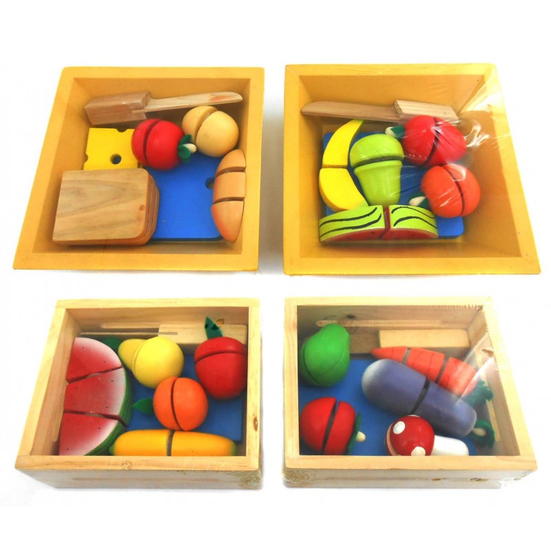 Mainan buah potong yang terbuah dari kayu, dilengkapi dengan kotak penyimpanan dan pisau.