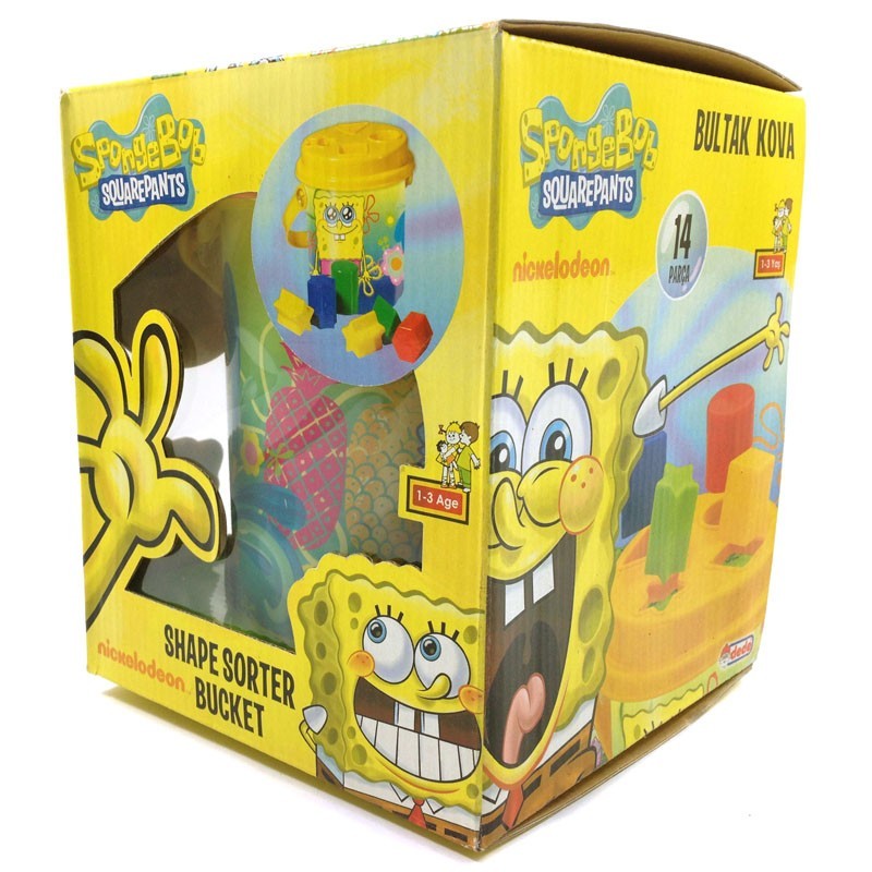 Mainan Ember yang berisikan berbagai bentuk yang dapat dimasukkan dari tutup ember dan berkarakter SpongeBob.