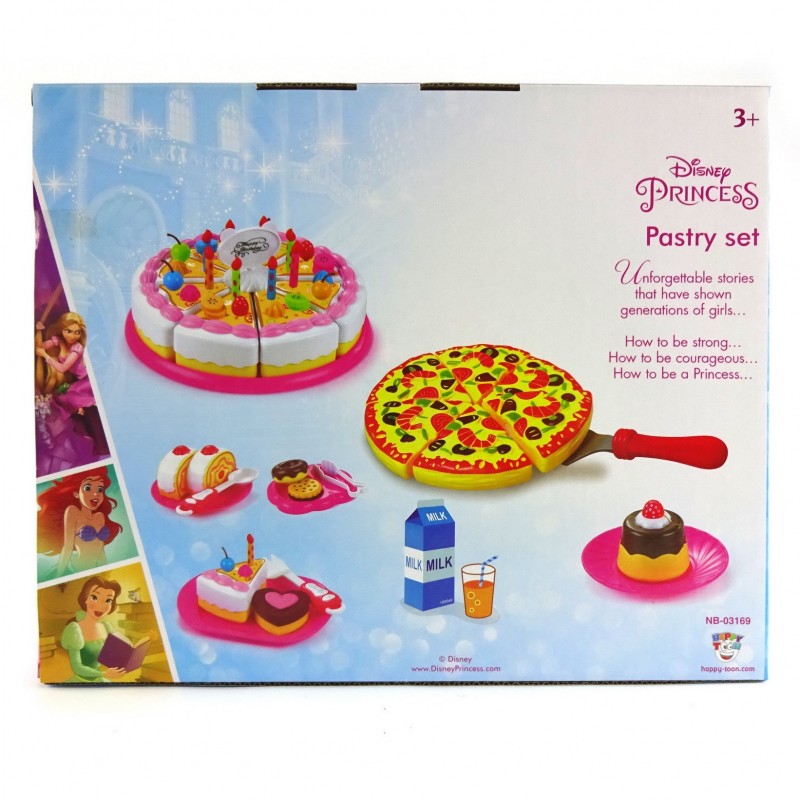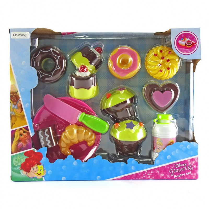 Mainan kue kue kecil yang terdiri dari berbagai jenis kue, lengkap dengan piring dan pisaunya.