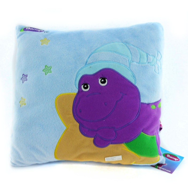 Bantal karakter Barney yang lucu, terbuat dari bahan kain yang lembut dan aman untuk anak.